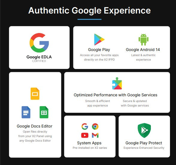 OS: Android 14, Google EDLA certified (full Play Store & Google services, protected by Play Protect)