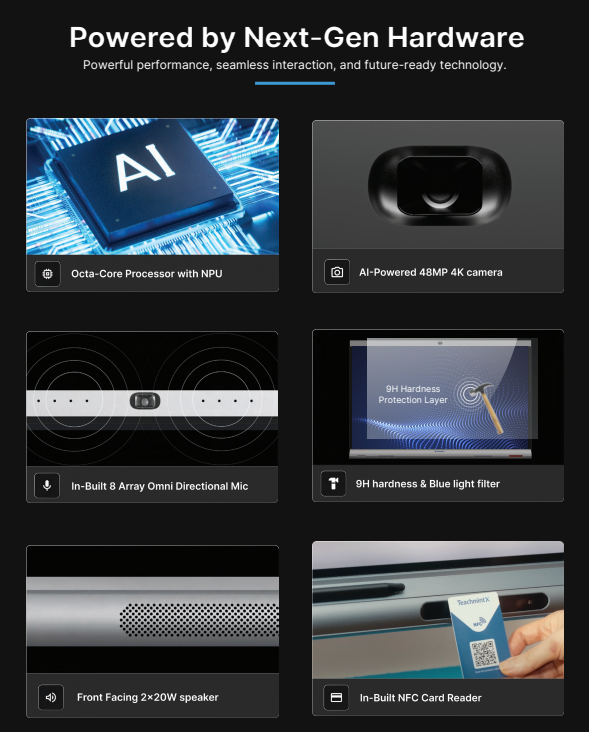 HDMI, USB 2.0/3.0, VGA ports, and NFC card reader (teacher login) .